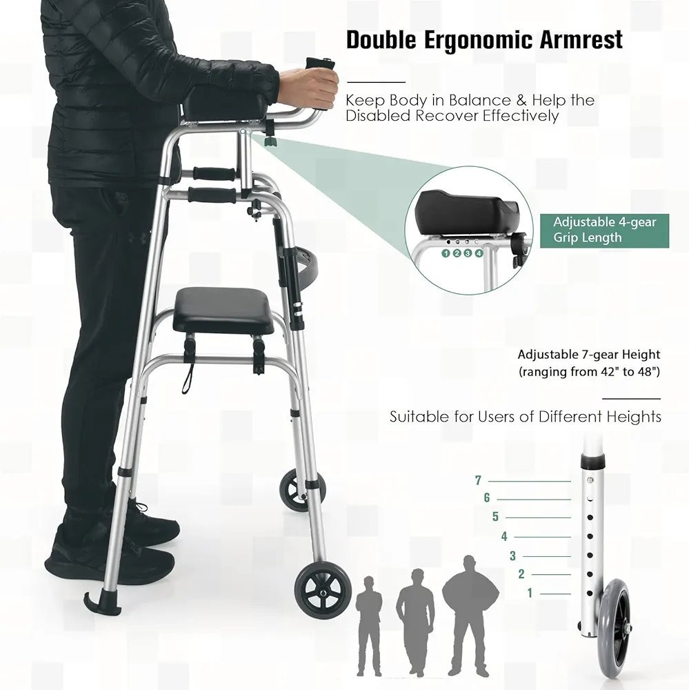 Adjustable Support Feet & Arm Rest: We have carefully designed 7-level height-adjustable support feet (ranging from 42″ to 48″) and 4-level adjustable double-arm rest, which can meet the needs of people of different heights. Our rehabilitation auxiliary walker can provide users with comfortable using experience and can be used indoors and outdoors.